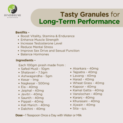 | Ingredients | Kesar, Safed Musli, Jaiphal, Javitri, Saunth, Pippali, Kali Marich, Dalchini, Ashwagandha, Lavang, Harad, Akarkara, Tejpatra, Nagkesar, Wheat Grass, Kapoor, Kamal Gatta, Banslochan, Karanj, Khurasani Ajwain, Ela, Shatavari, Sita |