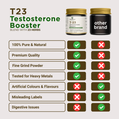 T23 Testosterone Booster by Hindbhumi Ayurveda is a herbal supplement made with pure herbs like Kesar, Safed Musli, Javitri, Nagkesar & 19 more herbs in granules form to support men’s well-being. It majorly promotes Testosterone Levels, Muscle Strength & Recovery and Holistic Vitality. It is formulated by fourth-generation Ayurvedic doctors and has been clinically tested. T23 Granules is made from natural ingredients and is generally safe for long-term use. It is a great and proven testosterone boosting supplement for those who wants to fast recovery of muscles and increase their physical strength in the gym.